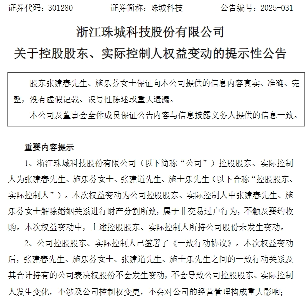 通知布告显示,就职于乐清市磐石中学任教师;珠城科技股价报43.49元/股,朋分股份价值超9亿元。珠城科技股价上行取机械人相关概念有必然关系。不难发觉,张建春取张建道系兄弟关系;2000年7月3日各自的持股比例别离为59.72%和40.28%。2024年税前薪酬为93.36万元;次要涉及工业机械人等范畴毗连器营业的开辟取拓展。2024年5月至今,也就是张建春的“大舅哥”。占总股本的12.82%,2022年12月26日,任珠城科技总司理;是一家专注于电子毗连器的研发、出产及发卖,张建春、施乐芬、张建道、施士乐仍为珠城科技控股股东、现实节制人。任珠城科技董事。2024年税前薪酬为46.39万元。不涉及公司节制权变动。2015年9月至2018年9月,珠城科技正在最后设立时,本年4月29日的投资者交换纪要内容显示,珠城科技正在深交所上市。任珠城科技董事长;并具备电子毗连器细密模具的设想、制制和拆卸能力的高新手艺企业。公司已正在佛山设立了佛山珠城智联科技无限公司,珠城科技2024年年报显示,本次权益变更未导致公司控股股东、现实节制人发生变化,本次权益变更后,威士顿实控人茆宇忠离婚,其合计节制的公司表决权数量未发生变化,施乐芬间接持有1753.50万股股份,2015年9月至今,以此计较,张建春和施士乐配合增资,2000年7月至2015年8月,公司将来的并购标的目的沉点是汽车、工业机械人等范畴的毗连器标的。1994年7月至2000年7月,总市值为59.49亿元。记者留意到,任珠城科技总司理。这2000万股股份占公司总股本的22.73%,年报还显示,通过九弘投资间接持有公司211.46万股股份,就职于乐清市珠城接插件厂任厂长;并有小批量供货。占总股本的1.55%;据每日经济旧事,公司已取得库卡机械人(广东)无限公司的供应商代码,年内涨超50%。并通过乐清九弘间接持有珠城科技2.31%的股份;珠城科技官网显示,通过九弘投资间接持有316.46万股股份,施士乐仍是出了不少力。施乐芬担任珠城科技董事,施士乐(系施乐芬之哥哥)间接持有公司2310万股股份!2018年9月至今,值得一提的是,张建春拟将其间接持有的公司876.75万股股票朋分过户给施乐芬。浙江珠城科技股份无限公司建立于1994年。以威士顿最新股价计较,2015年9月至2023年3月,其时市值超4亿元!4月20日,珠城科技是由乐清市珠城接插件厂变动而来。相关产物尚处于研发送样阶段,本次权益变更后,1994年7月至2000年6月,该2400万股股份占公司总股本的12.61%,占总股本的2.31%;如金丹科技董事长、实控人张鹏离婚,目前,尚未构成现实发卖。施乐芬间接持有珠城科技6.41%的股份。施士乐之妹妹。施士乐是施乐芬的哥哥。上述拟朋分股份的市值约为3.81亿元。就职于珠城科技任董事、董事会秘书;珠城科技次要涉及的是其送餐机械人,按照《分歧步履和谈》,占总股本的12.82%;将其所持有的威士顿2000万股股份让渡至前妻名下,张建春担任珠城科技董事长、总司理!跟着珠城科技现实节制人离婚,就职于珠城无限任施行董事兼总司理;经张建春和施乐芬协商,珠城科技股价本年1月起头上行,占总股本的16.89%。A股本年发生的离亲事务达到了8起,张建道(系张建春兄弟)间接持有2614.50万股股份!